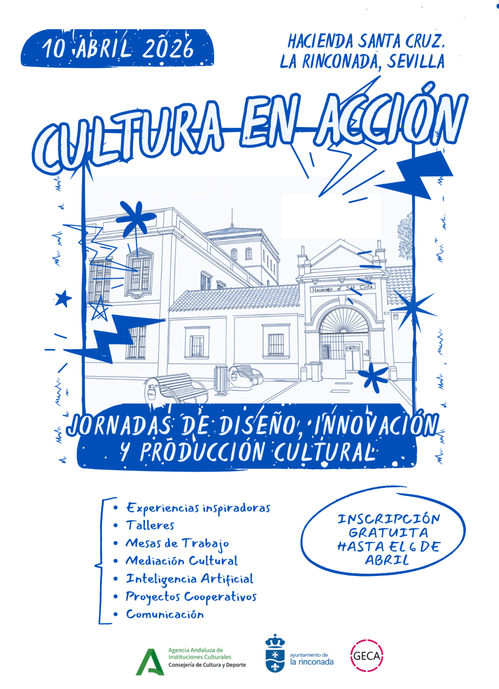 El Ayuntamiento de La Rinconada y el Área de Apoyo a las Industrias Culturales de la Agencia Andaluza de Instituciones Culturales (Junta de Andalucía) con la complicidad de la Asociación Andaluza de Profesionales de la Gestión Cultural GECA ponen en marcha esta jornada intensiva de trabajo dirigida a profesionales y estudiantes de Gestión Cultural. La manera de impulsar proyectos culturales del siglo XXI nos obliga a estar muy pegados al pulso de nuestros municipios, barrios y comunidades. También, de estar al día del contexto global en el que la tecnología y la inteligencia artificial marcan nuestro presente. Planificación, trabajo en red, territorio, mediación, comunicación e innovación se hacen términos recurrentes en la Gestión Cultural actual. A través de una metodología participativa, que combina presentaciones, mesas de experiencias inspiradoras, talleres y grupos de trabajo, trasladaremos a las personas participantes las principales herramientas que nos permiten impulsar iniciativas culturales coherentes con el escenario actual.